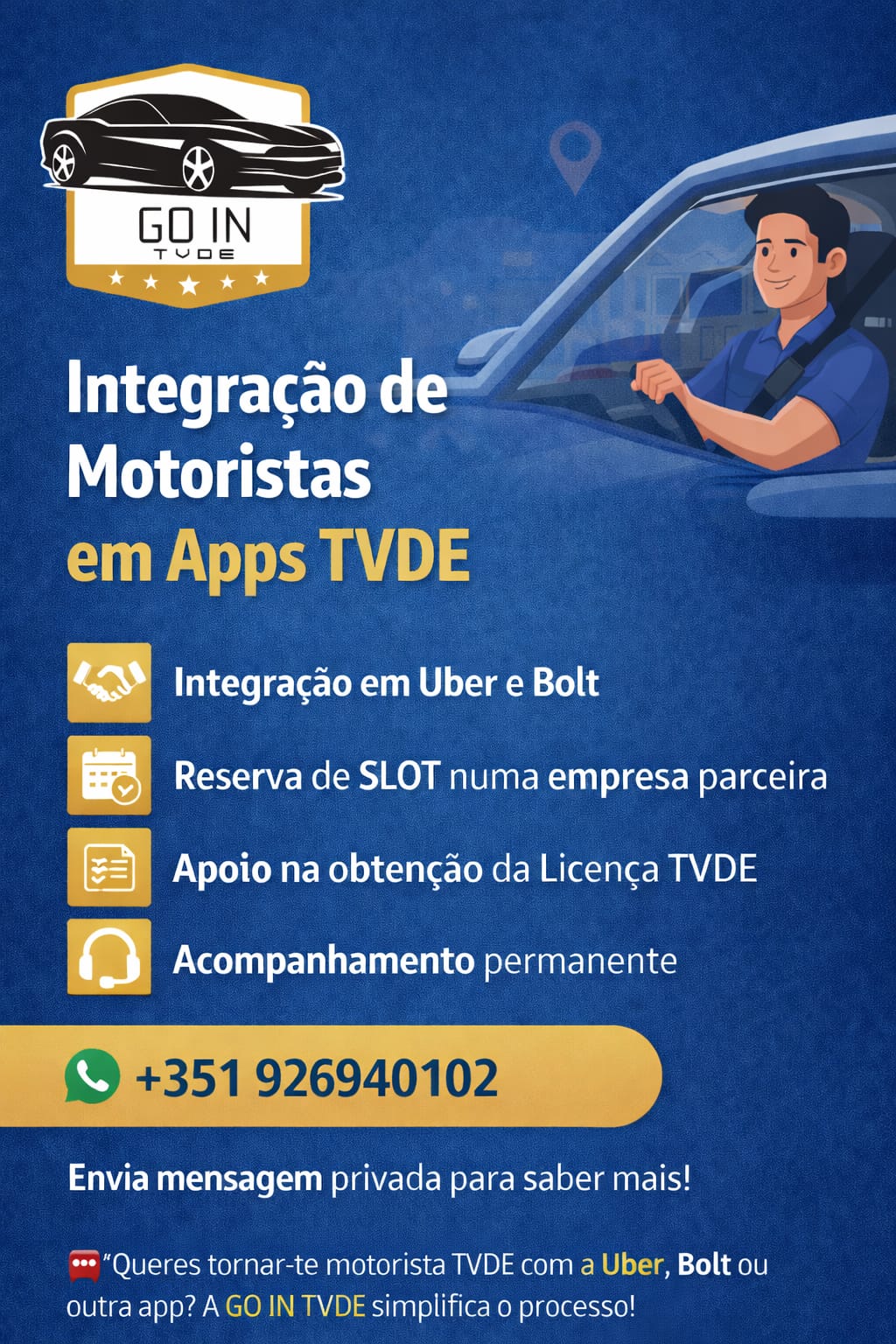 Na GO IN TVDE ajudamos motoristas a trabalhar de forma simples, segura e rentável nas plataformas como Uber e Bolt.